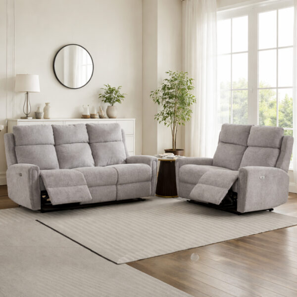 Enhance your living room with modern comfort and smart functionality with the Medinah Fabric Electric 3+2 Seater Sofa Set Ash. Upholstered in a refined ash fabric, this electric sofa set delivers a clean, contemporary look while offering superior relaxation through powered reclining seating. Designed for both everyday family use and entertaining, the Medinah electric sofa set includes a spacious 3 seater and a comfortable 2 seater, allowing everyone to enjoy personalised comfort at the touch of a button. Its plush cushioning, durable build, and minimalist styling make it a sophisticated centrepiece for any modern living space. The Medinah Fabric Electric 3+2 Seater Sofa Set Ash combines advanced comfort, modern design, and practical functionality. It is an ideal choice for creating a stylish, relaxing, and technology-enhanced living room environment. FEATURES : Material : Fabric Finish : Ash Set Included : 1 x 3 Seater Sofa, 1 x 2 Seater Sofa Experience the ultimate blend of style and comfort with our new Medinah Fabric Suite Effortlessly transition to your ideal comfort position with the electric recliner, featuring intuitive push-button controls and a convenient USB port to keep your devices charged Sink into luxurious pocket-sprung seats that offer superior support, while the high headrest provides the perfect spot to relax after a long day Smooth electric reclining mechanism for customised comfort Soft, high-quality fabric upholstery for lasting comfort Generously padded seats and supportive backrests Strong frame construction ensures durability and stability Neutral ash tone complements a wide range of interior decors Available at an affordable price Images shown are for illustrative purposes only 3 SEATER SOFA DIMENSIONS : Height : 103cm Width : 187cm Depth : 91cm 2 SEATER SOFA DIMENSIONS : Height : 103cm Width : 134cm Depth : 91cm