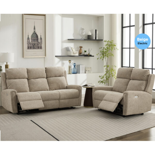 Enhance your living room with modern comfort and smart functionality with the Medinah Fabric Electric 3+2 Seater Sofa Set Beige. Upholstered in a refined Beige fabric, this electric sofa set delivers a clean, contemporary look while offering superior relaxation through powered reclining seating. Designed for both everyday family use and entertaining, the Medinah electric sofa set includes a spacious 3 seater and a comfortable 2 seater, allowing everyone to enjoy personalised comfort at the touch of a button. Its plush cushioning, durable build, and minimalist styling make it a sophisticated centrepiece for any modern living space. The Medinah Fabric Electric 3+2 Seater Sofa Set Beige combines advanced comfort, modern design, and practical functionality. It is an ideal choice for creating a stylish, relaxing, and technology-enhanced living room environment. FEATURES : Material : Fabric Finish : Beige Set Included : 1 x 3 Seater Sofa, 1 x 2 Seater Sofa Experience the ultimate blend of style and comfort with our new Medinah Fabric Suite Effortlessly transition to your ideal comfort position with the electric recliner, featuring intuitive push-button controls and a convenient USB port to keep your devices charged Sink into luxurious pocket-sprung seats that offer superior support, while the high headrest provides the perfect spot to relax after a long day Smooth electric reclining mechanism for customised comfort Soft, high-quality fabric upholstery for lasting comfort Generously padded seats and supportive backrests Strong frame construction ensures durability and stability Neutral Beige tone complements a wide range of interior decors Available at an affordable price Images shown are for illustrative purposes only 3 SEATER SOFA DIMENSIONS : Height : 103cm Width : 187cm Depth : 91cm 2 SEATER SOFA DIMENSIONS : Height : 103cm Width : 134cm Depth : 91cm